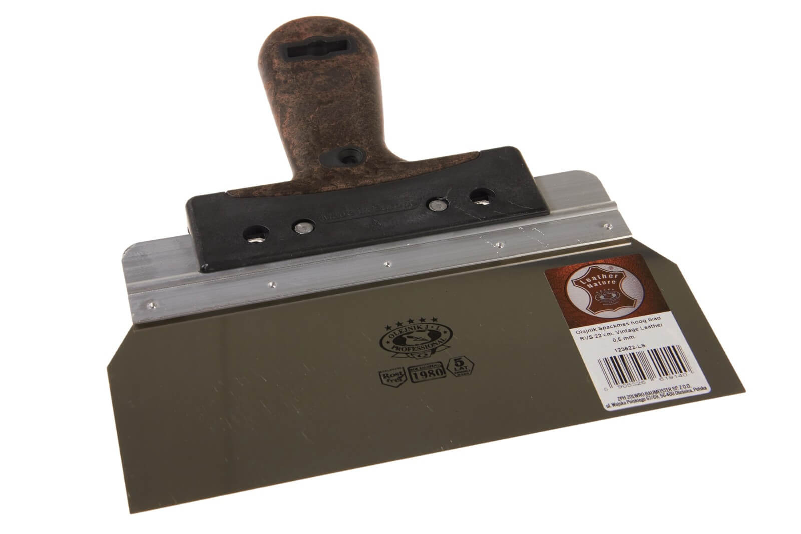 OLEJNIK, Spackmes 22cm, RVS, Hoog blad, Vintage Leather greep, 0,5mm